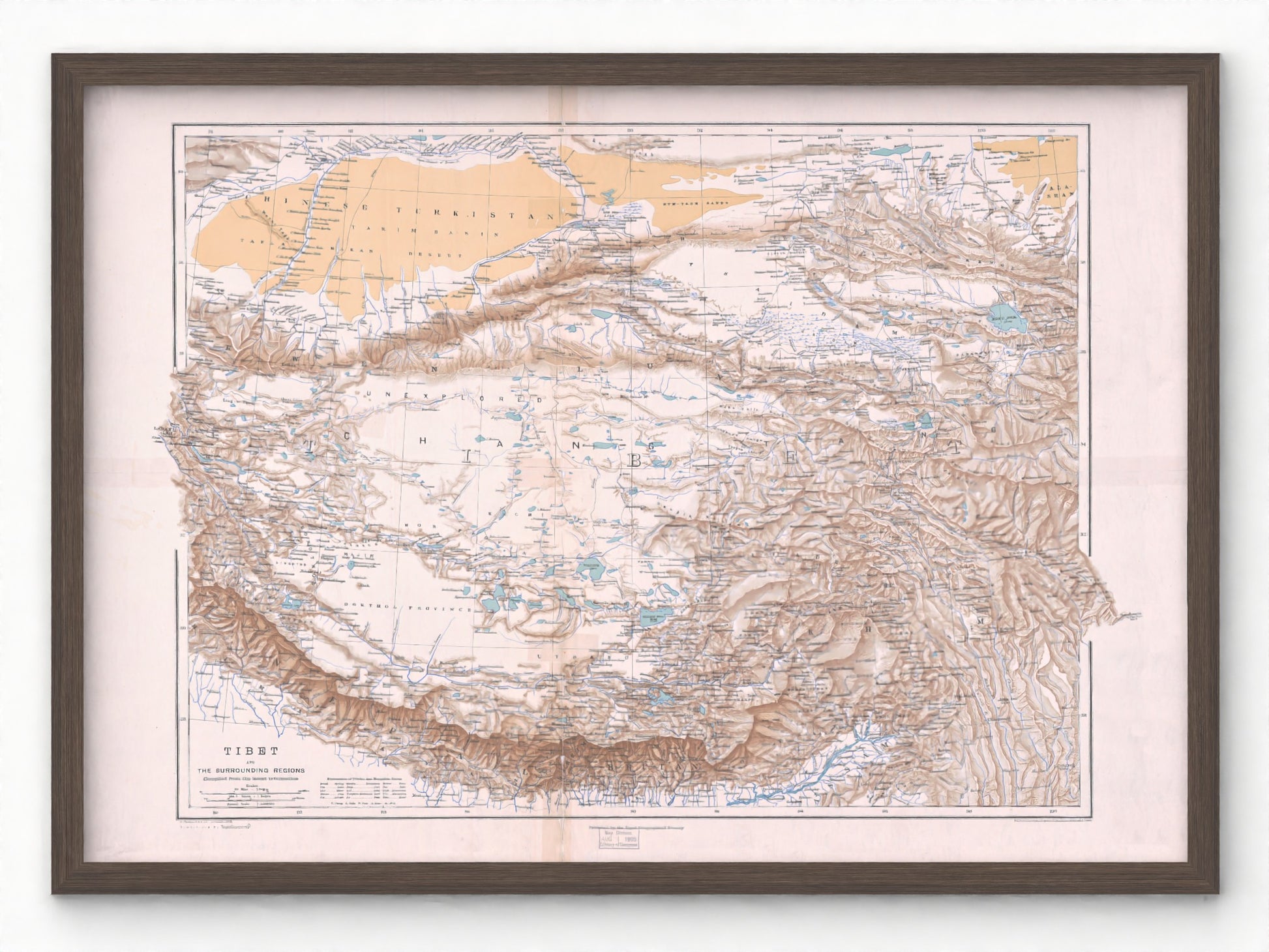 Geographic Features of Tibet – Displays mountains, rivers, lakes, and plateaus as they were known in 1904. Tibetan and Mongolian Place Names – Includes original names with a legend translating them into English. Historical Accuracy – Based on early 20th-century exploration data, reflecting the Western understanding of the region at the time. Intricate Cartographic Details – Fine linework, shading, and typography typical of early 1900s mapmaking. Vintage Aesthetic – Features an aged, historical style that adds a classic, timeless look to your space. Cultural and Political Borders – Marks the regional divisions and boundaries as they were recognized in 1904. Expedition Routes – May show paths taken by explorers or surveyors mapping Tibet during that period. Scale and Compass Rose – Includes a reference for distances and orientation for better readability. Hand-Drawn Elements – Preserves the artistic craftsmanship of early cartographers. Remastered Clarity – Digitally enhanced to improve readability while maintaining its authentic vintage charm.