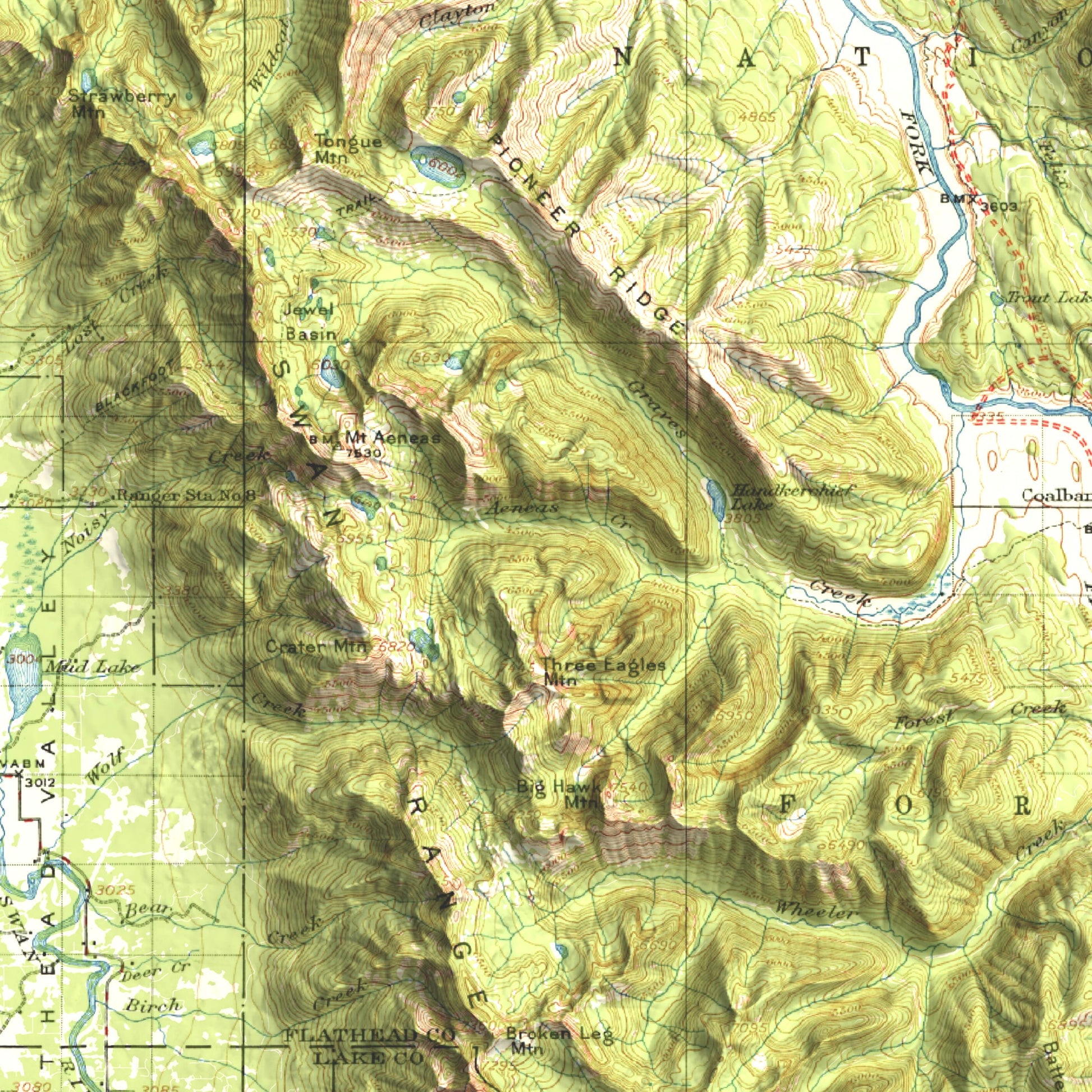 1914 Nyack | Jewel Basin, Flathead Alps & Glacier National Park, MT | 30'x30' Shaded Historic USGS Map