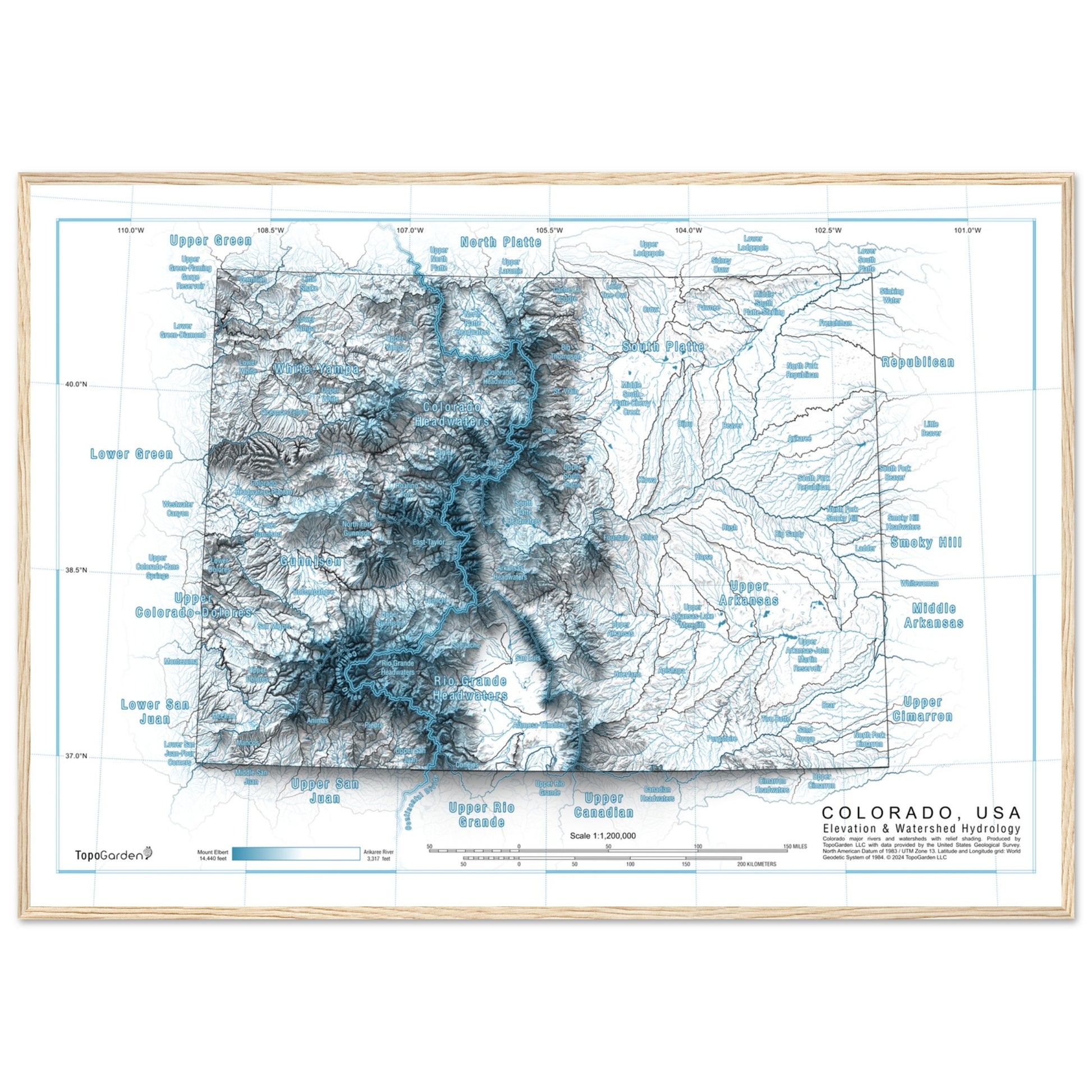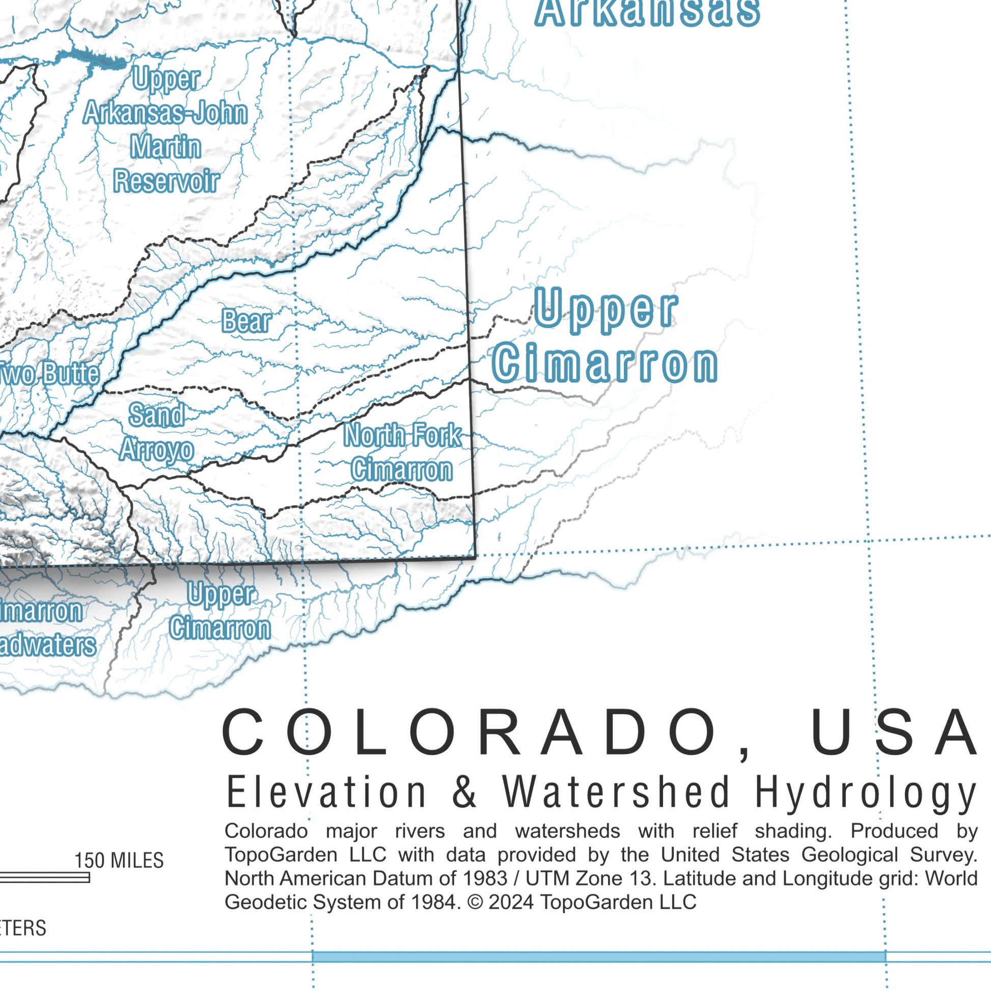 Key Features: Detailed Watershed Boundaries: The map showcases two distinct levels of watershed boundaries. Smaller watersheds and tributaries are outlined, providing a granular view of Colorado's river network. Larger watersheds, composed of these smaller tributaries, are also delineated, offering a comprehensive overview of the state's hydrological structure. Labeled Major Rivers: Each of Colorado's major rivers is clearly labeled, ensuring easy identification. Key rivers such as the Colorado River, Arkansas River, Rio Grande, South Platte River, Gunnison River, Yampa River, White River, San Miguel River, Animas River, Dolores River, Purgatoire River, and Blue River are prominently featured. Significant Tributaries: Tributaries that are hydrologically significant or cover a large enough area are also outlined and labeled. This includes various forks and branches, providing a thorough understanding of the interconnectedness of Colorado's waterways.